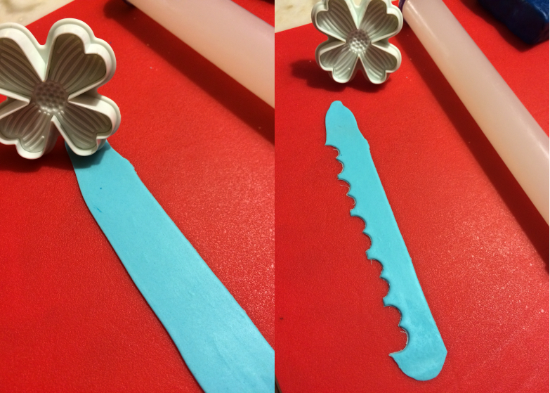 J’ai également utilisé mon emporte-pièce à poussoir dogwood pour découper des bandes de pâte  sucre bleu ciel que j’ai fixé sur le haut des murs du palais. Voici le résultat.