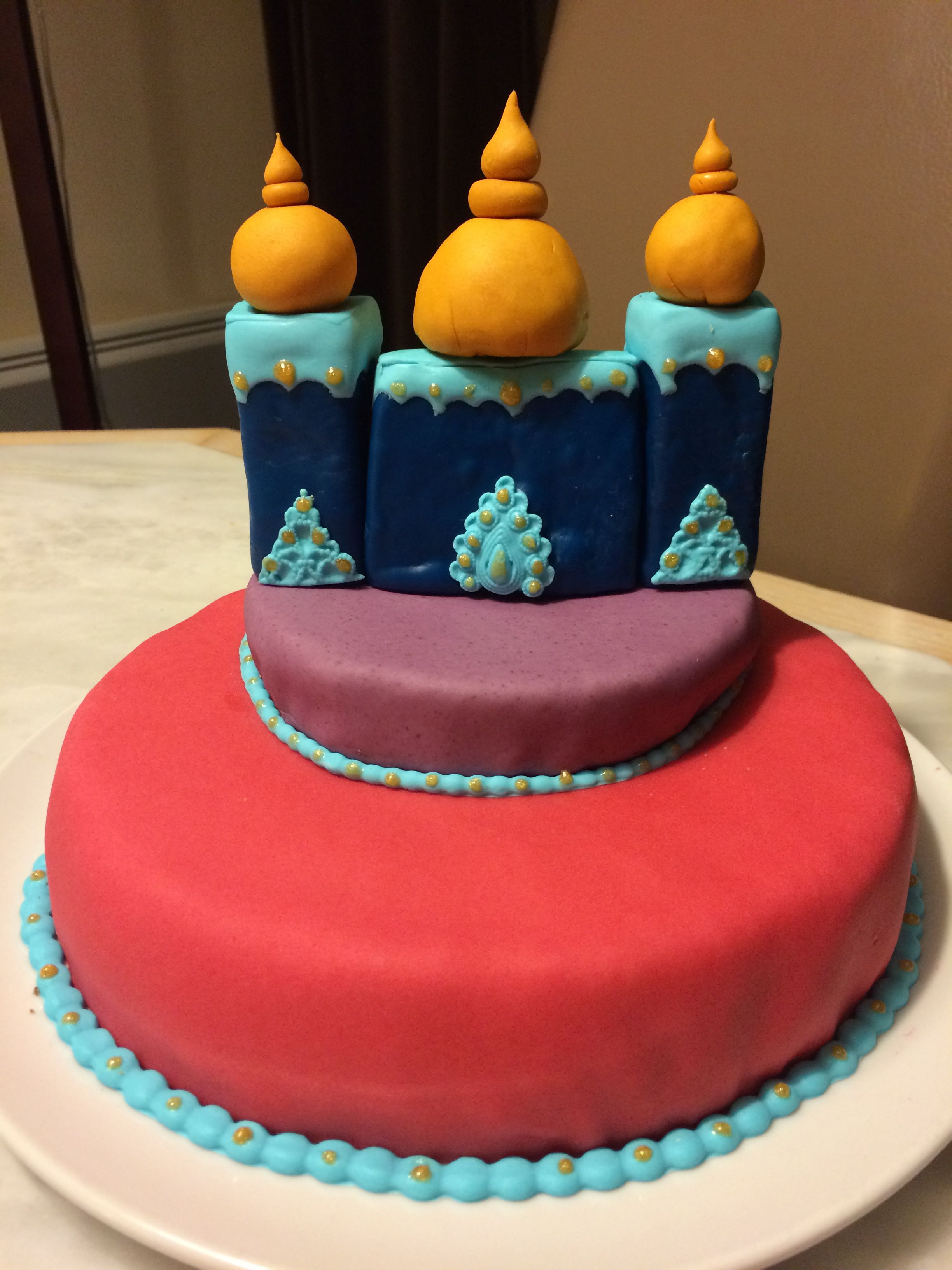 Les dômes ont été collés sur le dessus du palais et celui-ci fixé sur le dessus du gâteau à l’aide de cure-dents. Voici le résultat final.