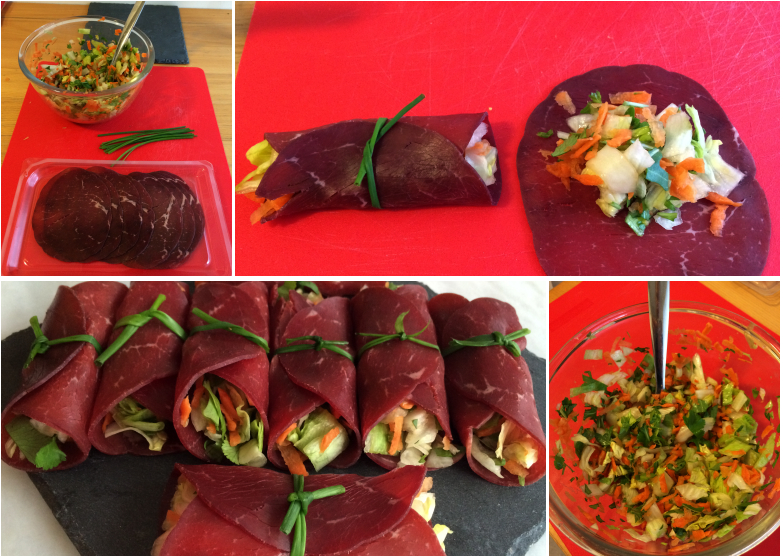 J’ai remplacé certains ingrédients de la recette initiale pour utiliser des produits que j’apprécie davantage comme la roquette et la coriandre. Voici donc ma version de rouleaux de pavé tendre de boeuf séché aux légumes de saison.
