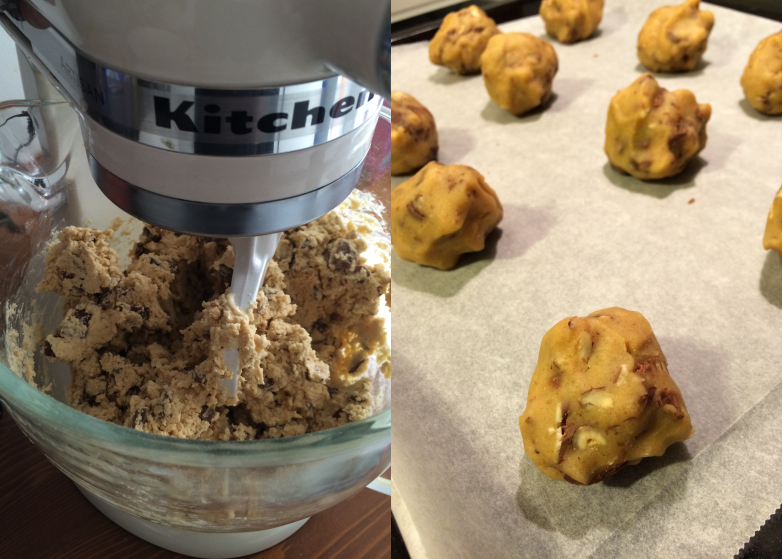 - Ressortez la préparation du réfrigérateur et prélevez de la pâte à l’aide de deux cuillères à soupe et formez des boules à peu près égales.