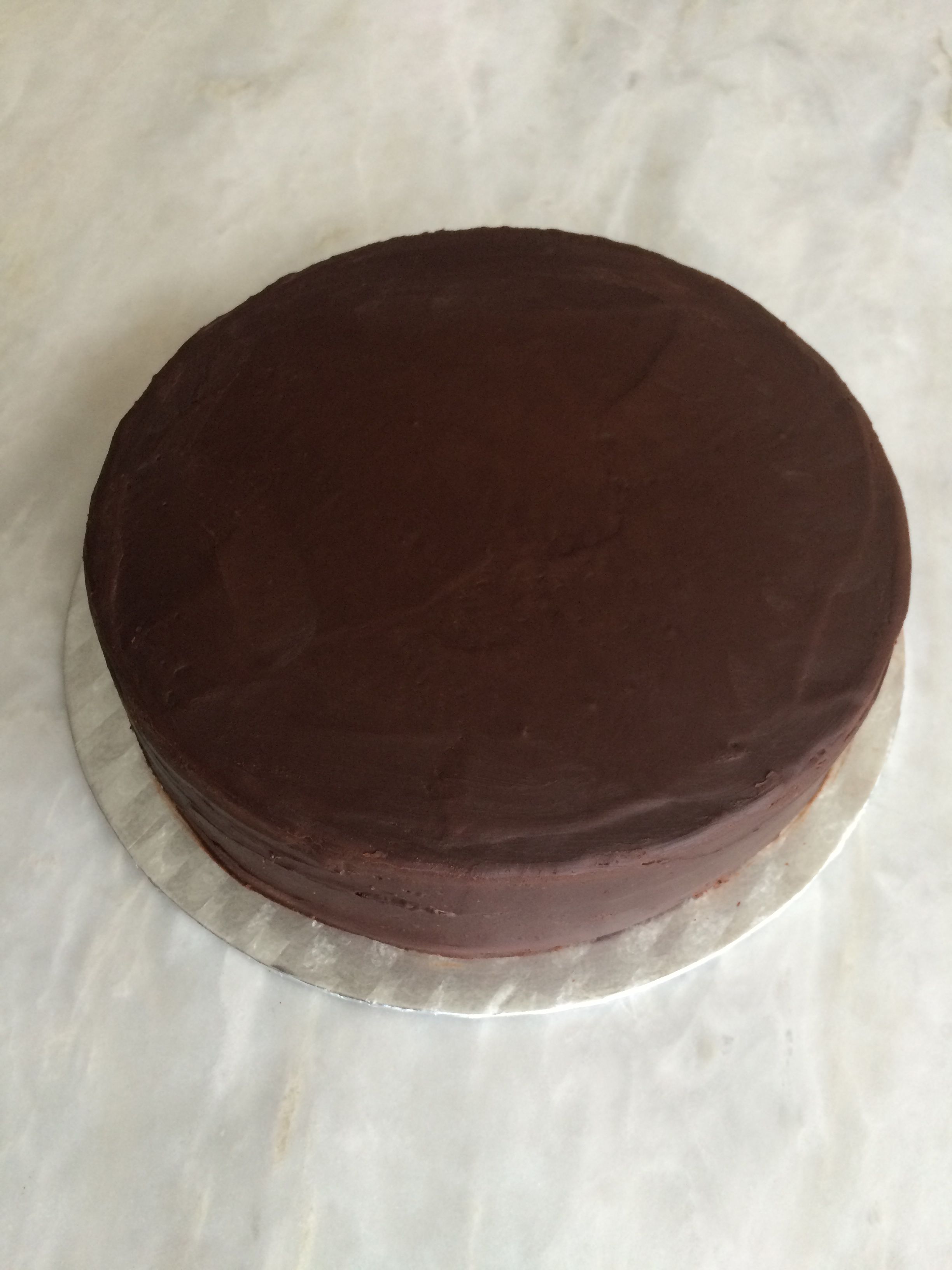 Recouvrez le premier gâteau de ganache au chocolat corsé et recouvrez le du deuxième gâteau. Recouvrez ensuite la totalité du gâteau à l’aide de ganache au chocolat corsé. Réservez ensuite au réfrigérateur une heure pour que la ganache durcisse bien.