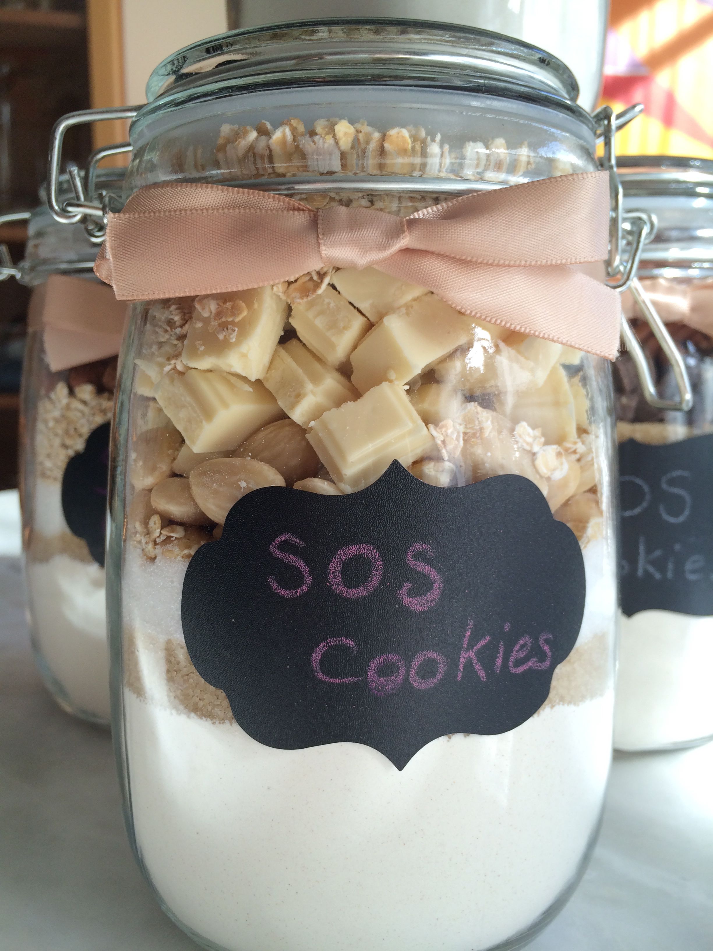 Pour finaliser la décoration de ces bocaux, j’ai utilisé des étiquettes ardoise autocollante sur lesquelles ma chouquette a écrit « SOS Cookies  » et « Merci et bonnes vacances maîtresse ». J’ai ensuite ajouté un joli ruban de couleur crème.