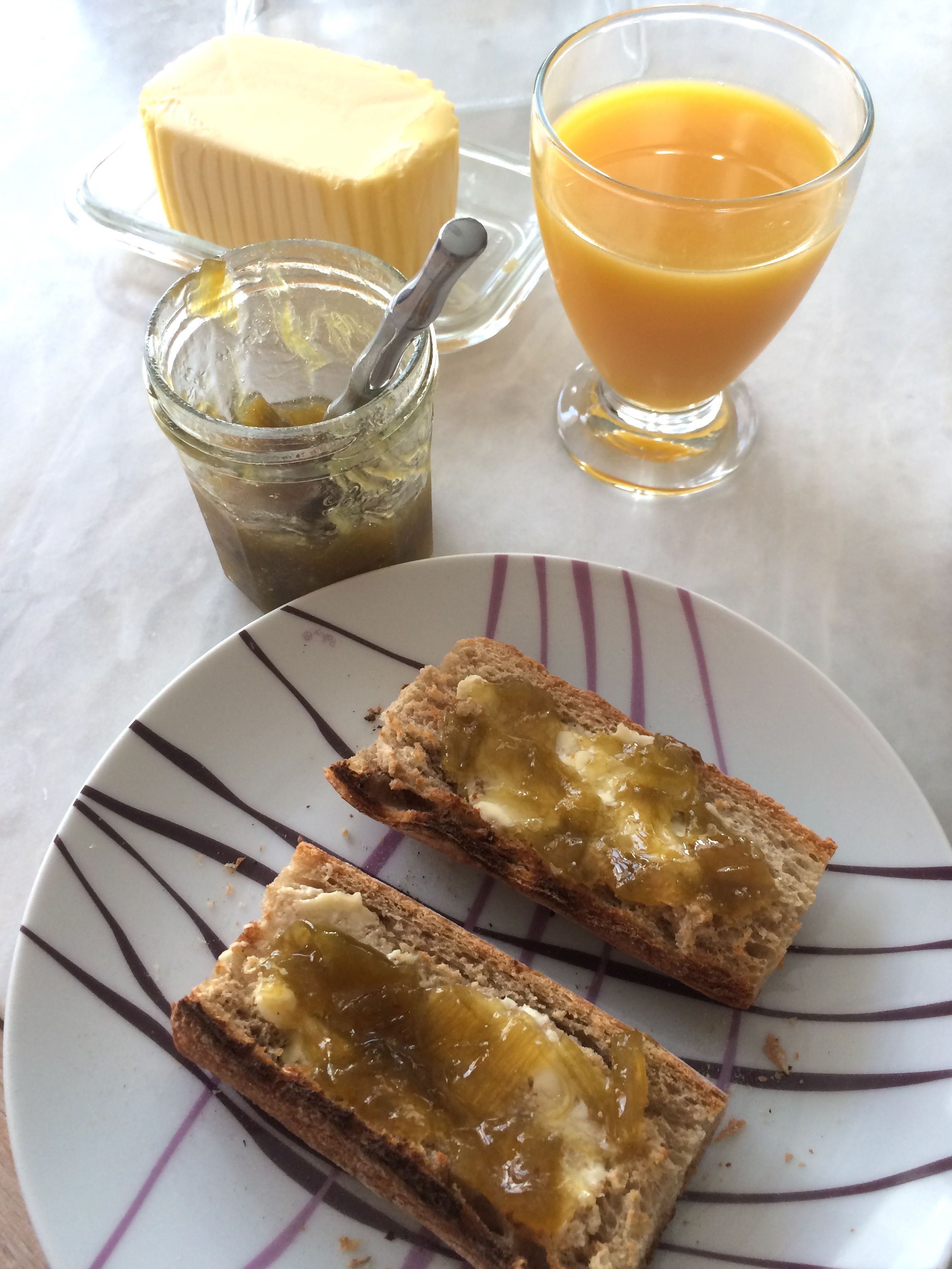 Après avoir expérimenté la confiture de rhubarbe et fraise, voici celle que je déguste au petit déjeuner : la confiture de rhubarbe vanille et miel.