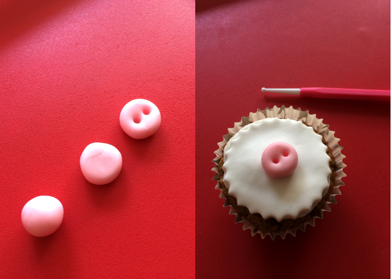 Pour préparer le museau de mon mouton, j’ai utilisé une petite boule de pâte à sucre rose que j’ai légèrement écrasée puis percée de deux trous en son centre à l’aide d’un outil de modelage muni d’une micro-boule (comme sur la photo).