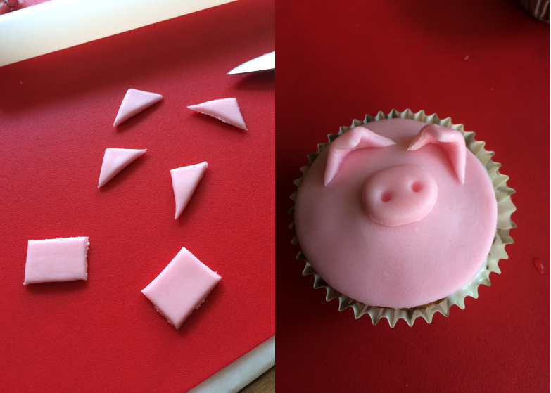 Je l’ai ensuite disposé au centre de mon cupcake cochon. La pâte à sucre colle naturellement lorsqu’elle est travaillée mais si ce groin ne tient pas en place utilisez une colle alimentaire pour le fixer.