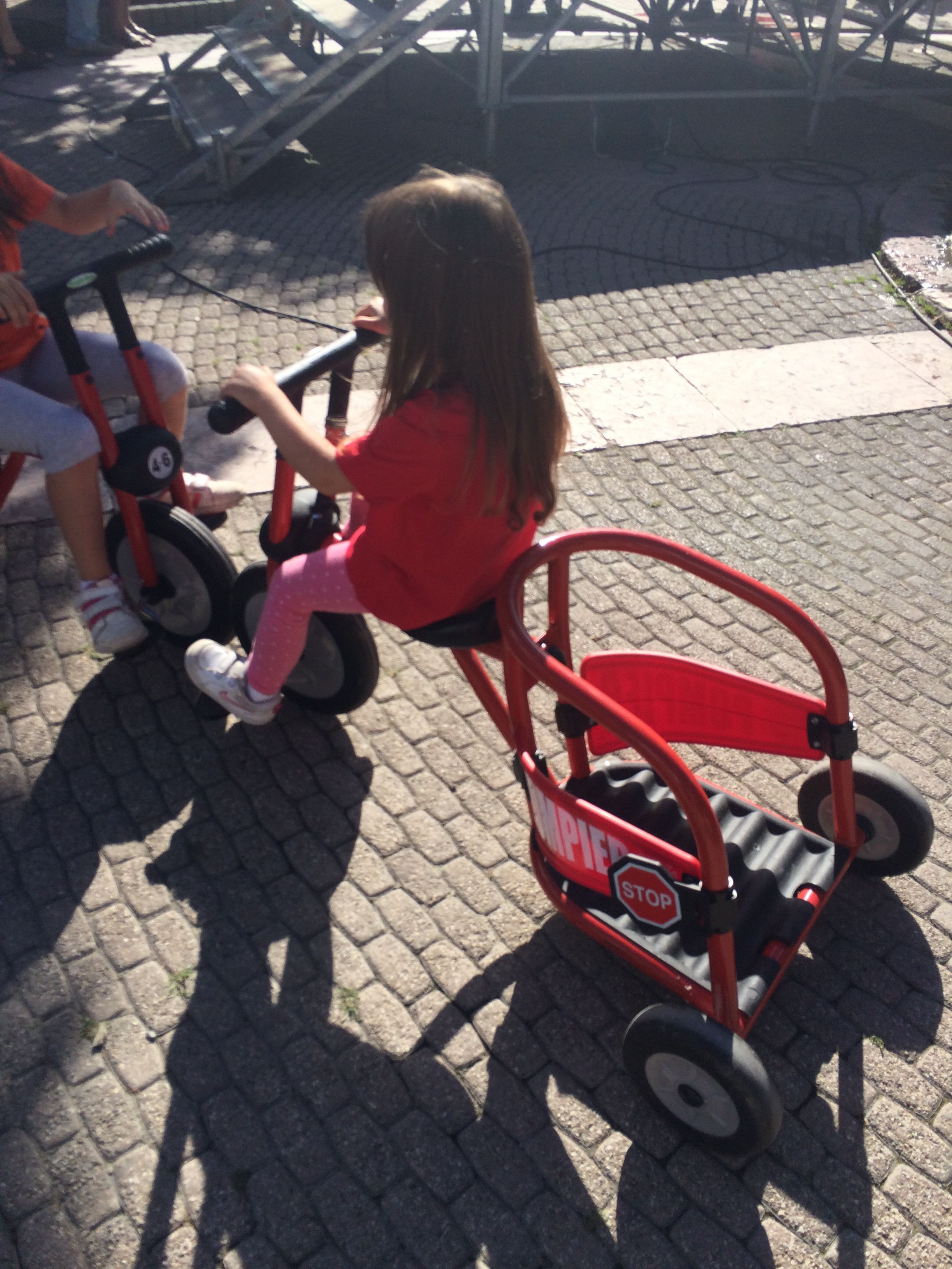 Les enfants se prennent au jeu aux commandes de ces petits tricycles customisés en voitures de pompiers. Il ne manque plus que les pistolets à eau pour éteindre le feu !