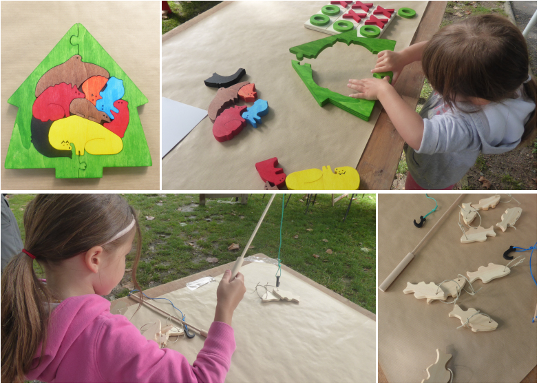 Et pendant que les figurines peintes sèchent, les enfants jouent avec les jouets proposés sur la tables à côté : puzzle, casse-têtes, pêche à la ligne…