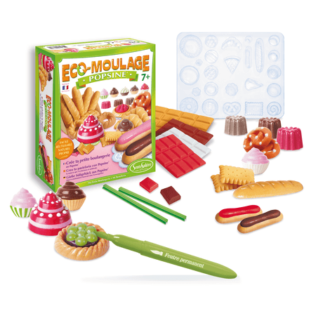 Dans le coffret, on trouve de la Popsine sous forme de tablettes de couleur blanche, biscuit, chocolat noir et rose avec laquelle on prépare de petites baguettes de pain, des gâteaux, des biscuits et des tartes.