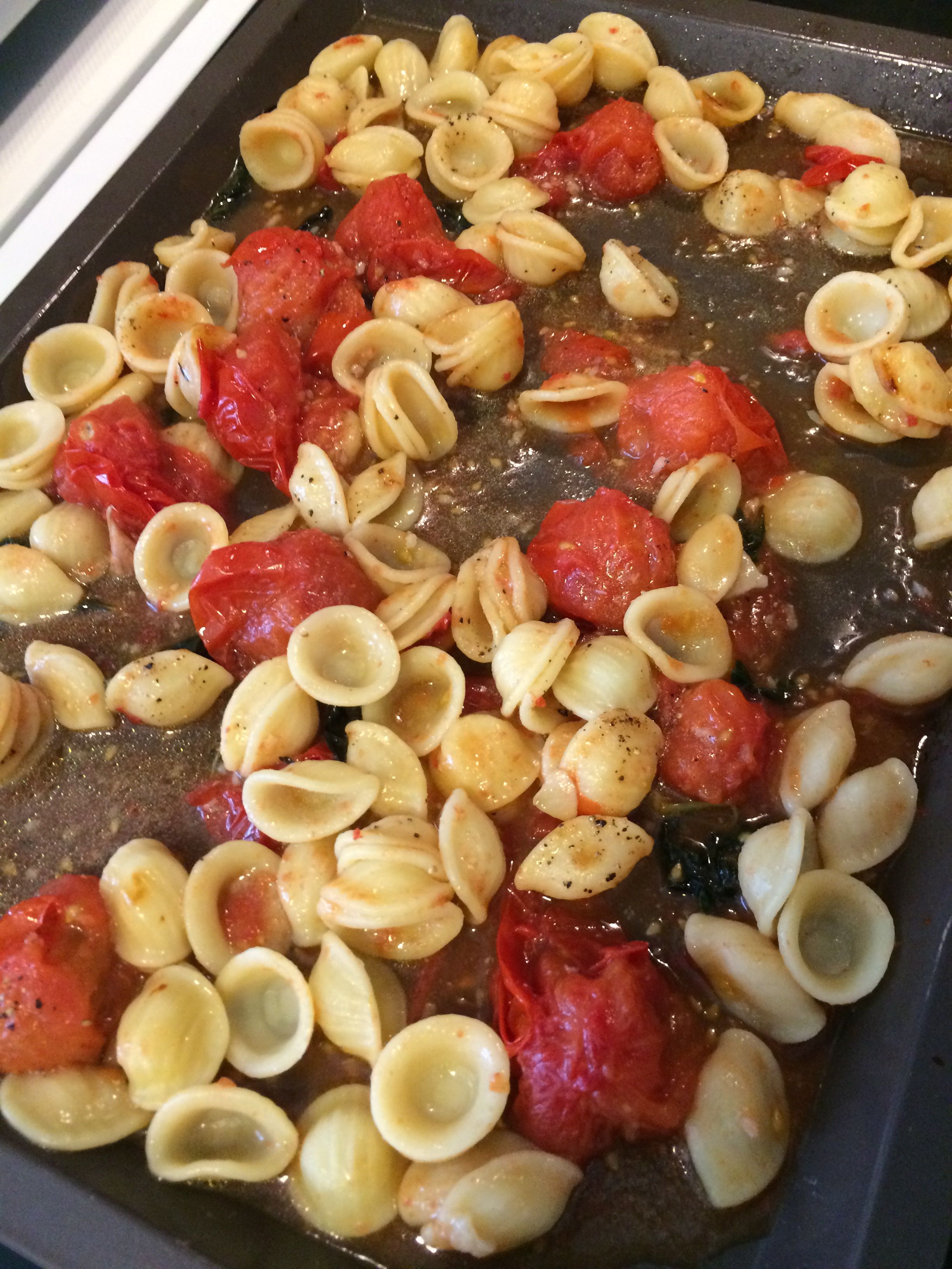 7. Incorporez les orecchiettes aux tomates et ail, directement sur la plaque de cuisson.