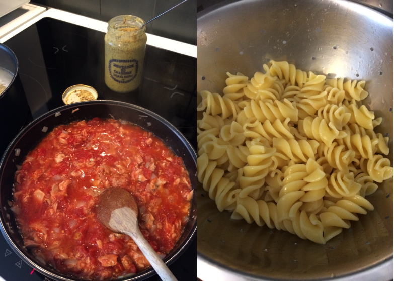 - Versez la sauce au thon et à la moutarde sur les pâtes puis parsemez de parmesan fraîchement râpé.
