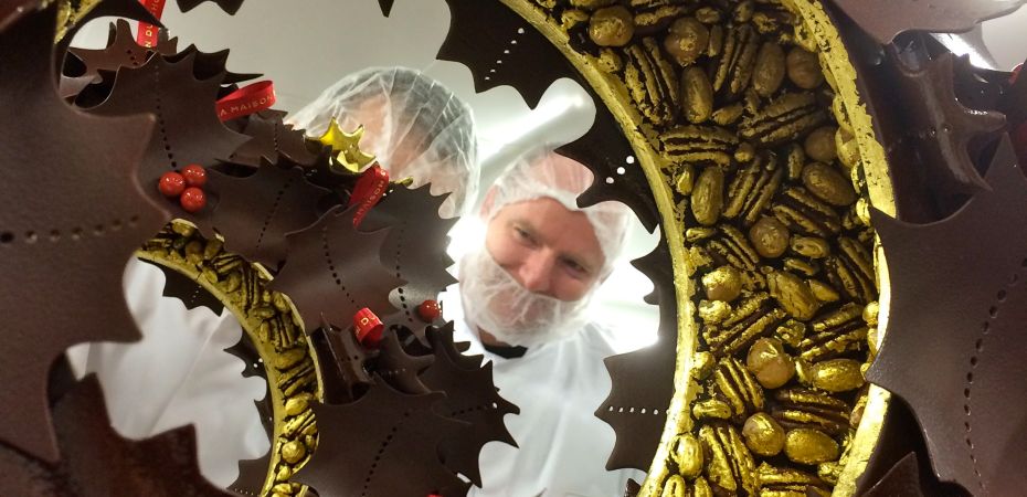 Lors de notre visite, l’ambiance était magique dans les ateliers de la Maison du Chocolat. L’équipe de chocolatiers de l’atelier de création finalisait les pièces de la collection Féérie de Noël composée cette année de sublimes couronnes imaginées par Nicolas Cloiseau.