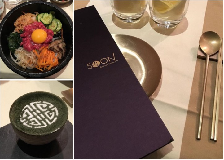 Soon est un très joli restaurat coréen situé à deux pas des Champs Elysées. On peut y déguser les fameux bimbap qui sont des bols en pierre brûlante sur lesquels vont cuire sous vos yeux les ingrédients crus présentés de manière très organisée. J’ai goûté le dolsotbi bimbap et son riz recouvert de légumes, de viande, et d’un oeuf. On termine le repas par un tiramisu coréen à base de thé vert : un régal délicatement présenté.