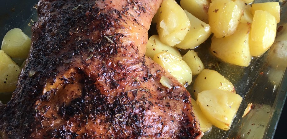 2. Dans un grand plat, déposez votre cuisseau. Arrosez le de l’équivalent de 2 cuillères à soupe d’huile, salez et poivrez puis saupoudrez de thym. Retournez plusieurs fois le cuisseau pour qu’il soit recouvert d’huile et d’épices de chaque côté.