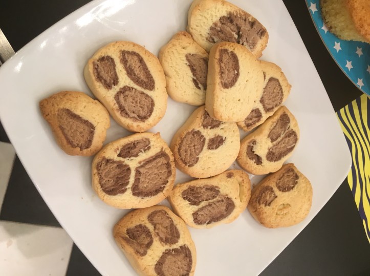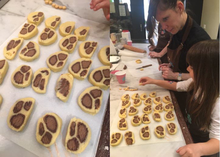 Lorsque les cupcakes sont décorés, les enfants préparent ensuite des sablés léopard en mélangeant plusieurs pâtes de couleurs différentes.