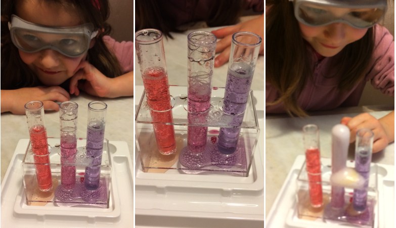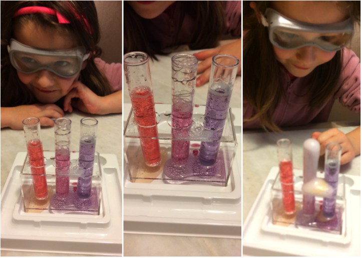 Cette grande curieuse était ravie de pouvoir tester quelque chose de nouveau. Les lunettes de protection, les tubes à essai, des solutions colorées rendent les expériences encore plus sympa. Tout est fait pour jouer le jeu du scientifique dans son laboratoire.