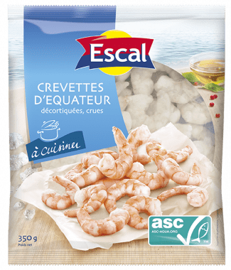 J’ai utilisé les crevettes surgelées, entièrement décortiquées et crues de la marque Escal. Ces crevettes d’Equateur sont réputées pour leur saveur fine et parfumée, ainsi que pour leur chair ferme. Elles sont issues d’un élevage extensif certifié ASC. Elles sont disponibles en sachet de 350 grammes.
