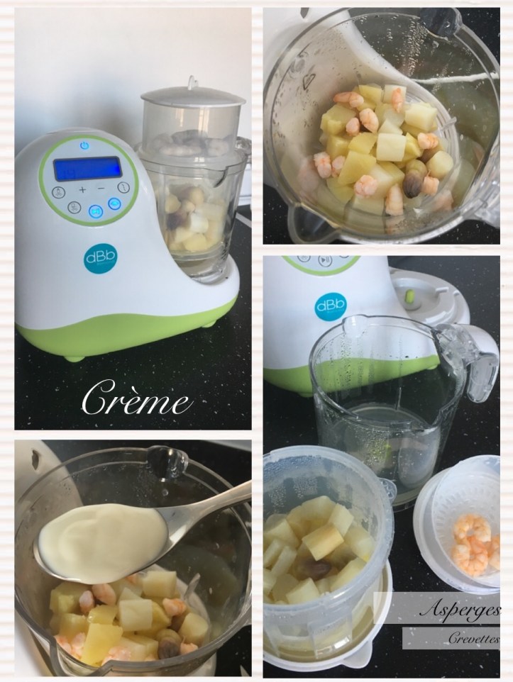 Pour un résultat avec morceaux (si bébé commence à manger des plats avec morceaux fondants) : vous pouvez écraser la pomme de terre à la fourchette et l’ajouter ensuite au mélange mixé d’asperges, de crème, lait et de crevettes. Ajoutez de l’eau de cuisson si le résultat est trop épais. Ajoutez ensuite les pommes de terre écrasées.