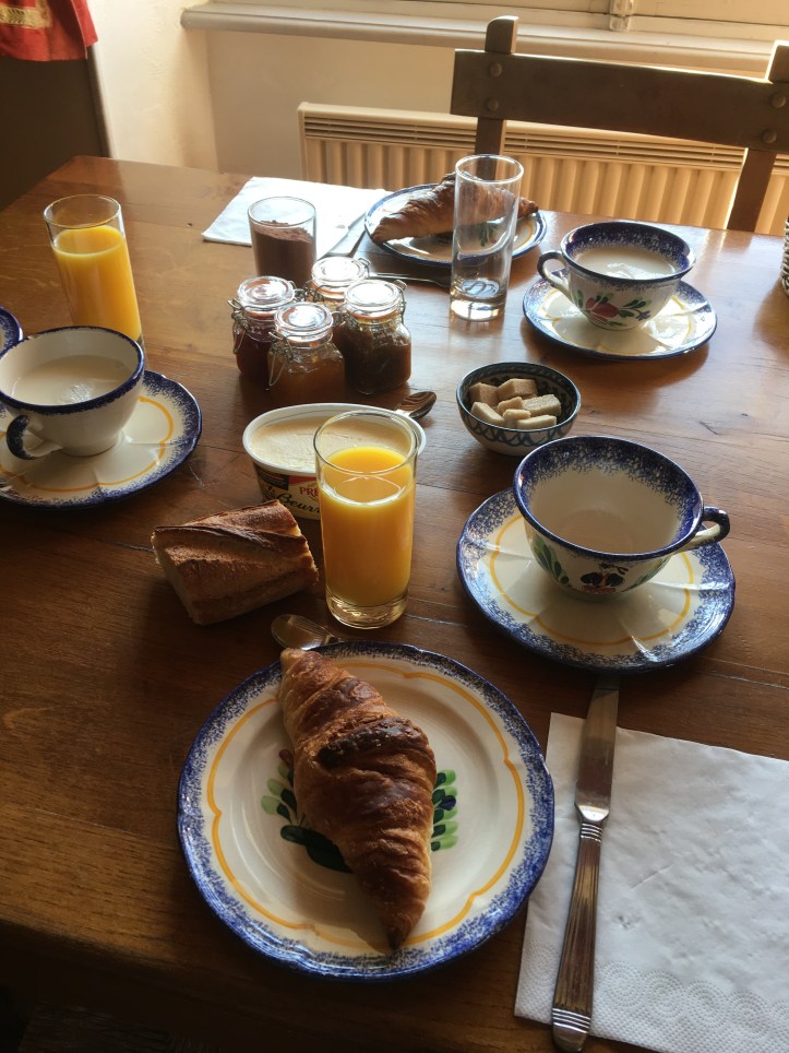 Pour le petit déjeuner, nous avons fait appel à notre hôte qui nous avait proposé de remplir le réfrigérateur avec du beurre, des confitures maison, du lait et du jus d’orange. Elle nous a également apporté du pain frais et des croissants le matin.