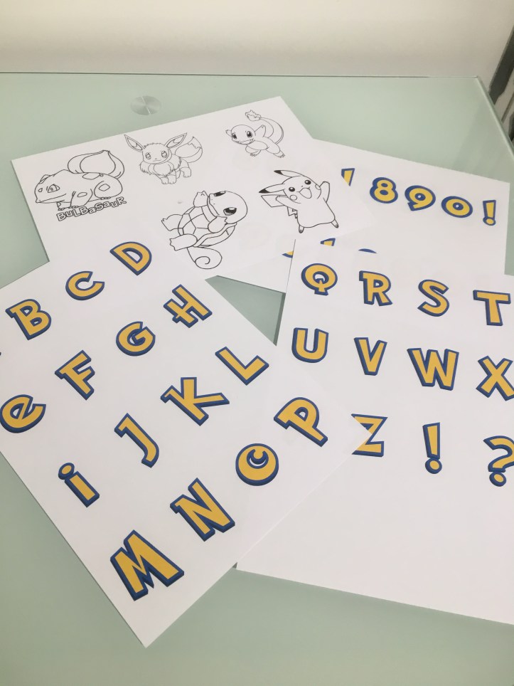 Pour coller au thème Pokémon, j’ai trouvé sur le net des pages de lettrage comme celui utilisé dans les dessins animés Pokémon soit des lettres jaunes sur fond bleu.