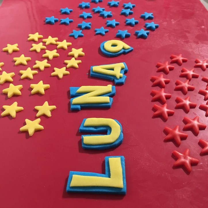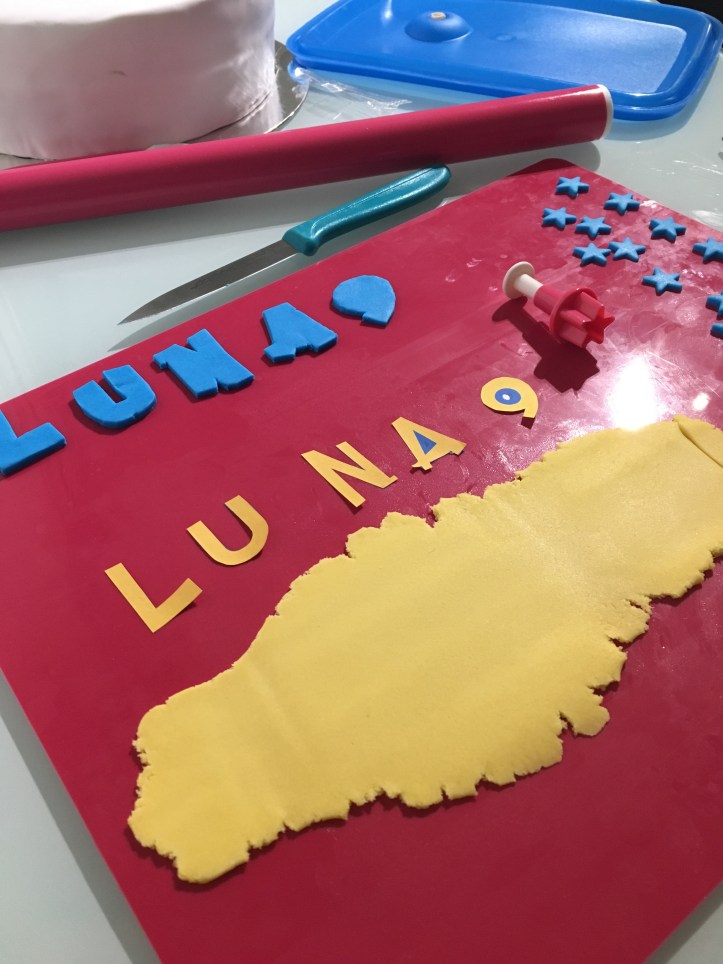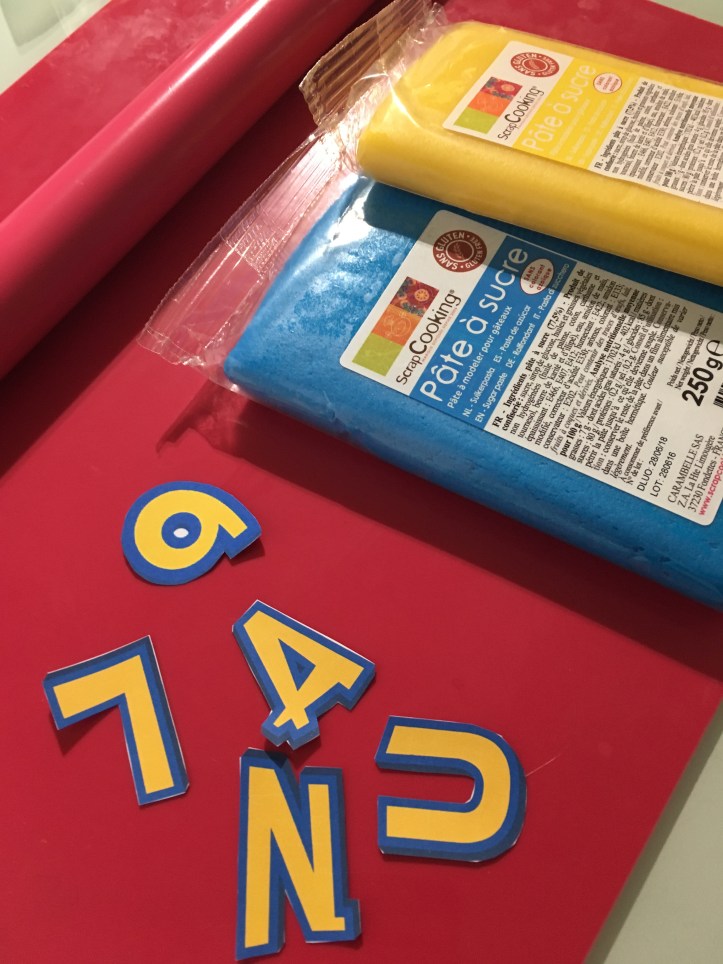 J’ai utilisé de la pâte à sucre jaune et bleu dans lesquelles j’ai découpé les lettres du prénom de ma fille et son âge.
