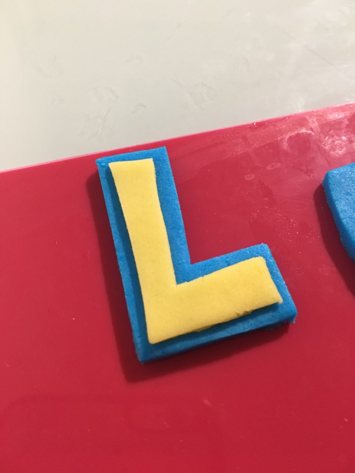 J’ai ensuite collé ensemble les deux lettres de couleur bleue et jaune avant de les faire sécher.