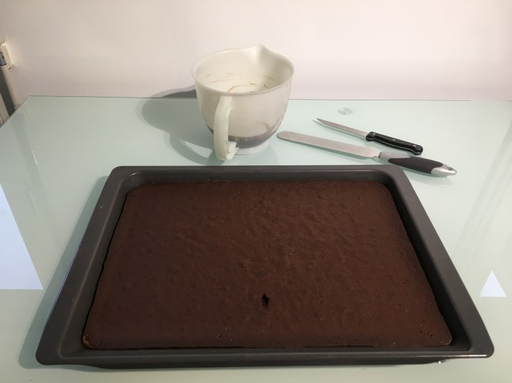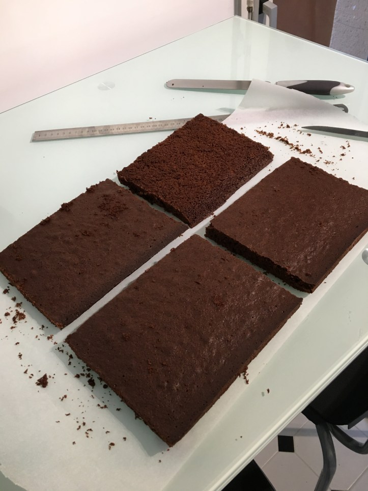 J’ai cuit ce gâteau dans le plat le plus grand que j’avais à ma disposition pour obtenir une surface assez importante que je puisse découper en quatre et empiler pour former un grimoire.