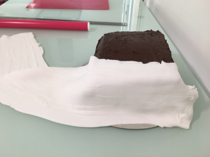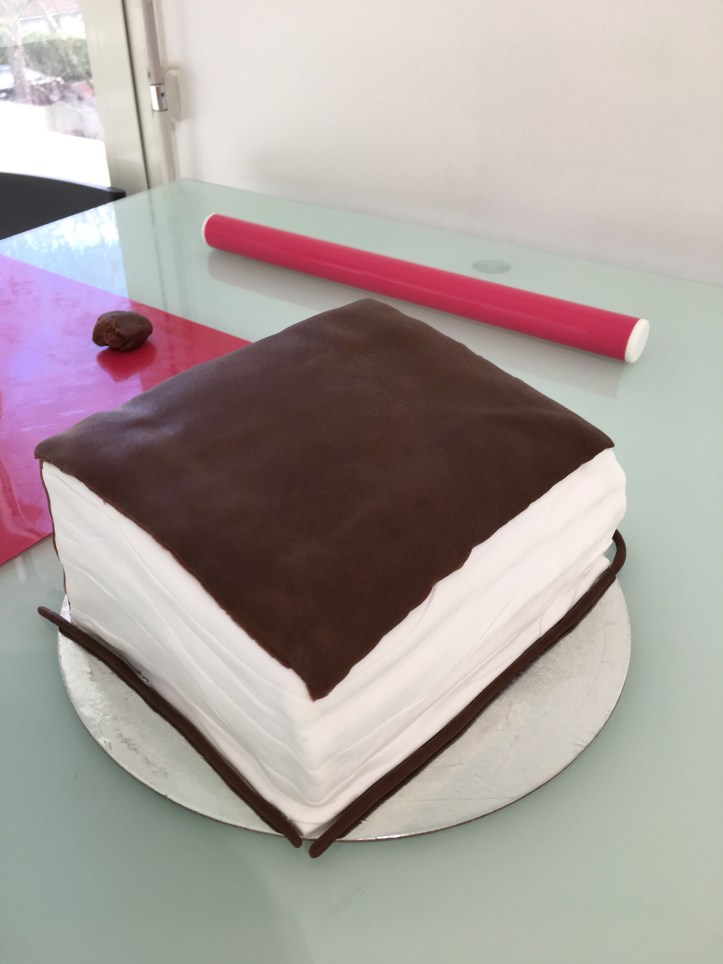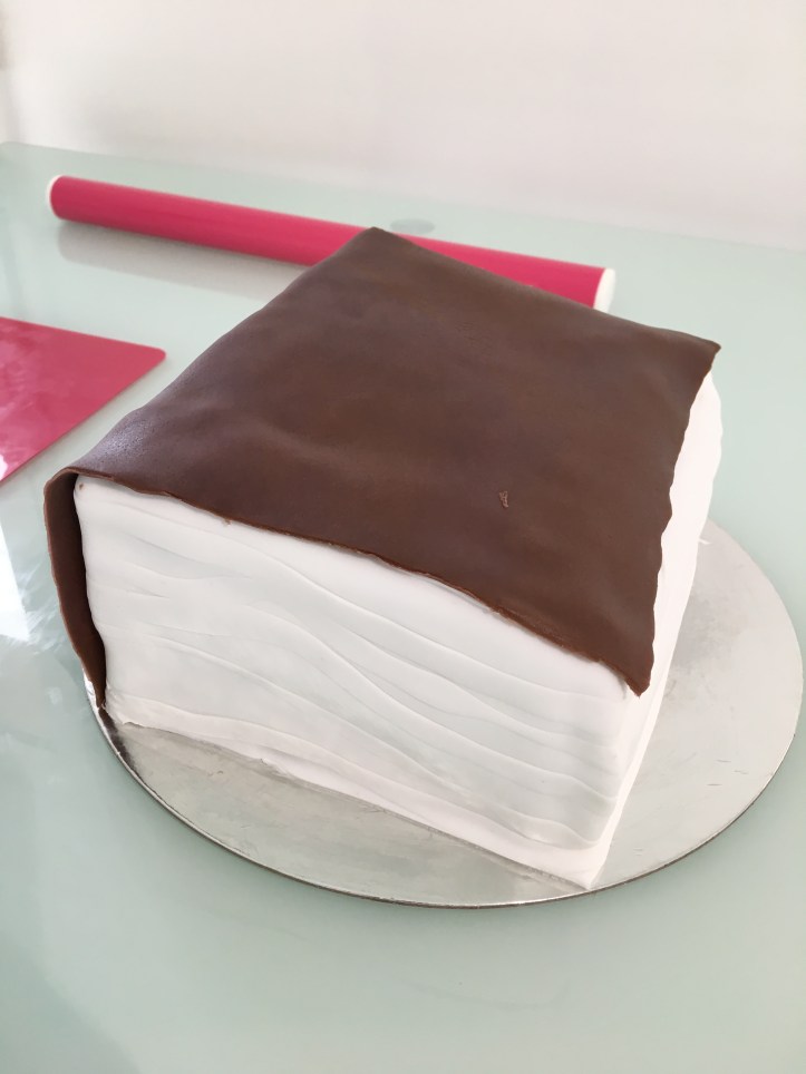 Étalée délicatement sur le grimoire, la pâte à sucre marron prend parfaitement la forme de la couverture d’un livre.