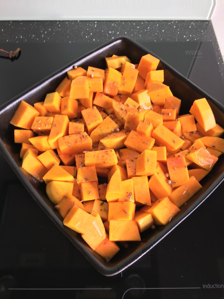 4. Enfournez à mi-hauteur et laissez cuir en prenant soin de mélanger les cubes de butternut de temps en temps.