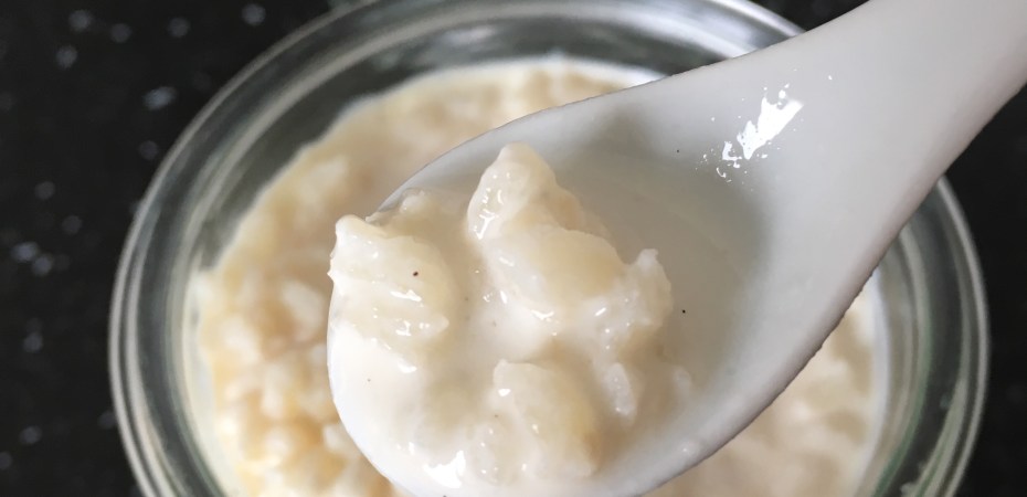 - Lorsque le mélange a épaissi ajouter une cuillère à soupe de lait froid et poursuivez la cuisson. Renouvelez l’opération puis versez le riz au lait encore chaud dans des petits pots et laissez refroidir à l’air libre puis au réfrigérateur.