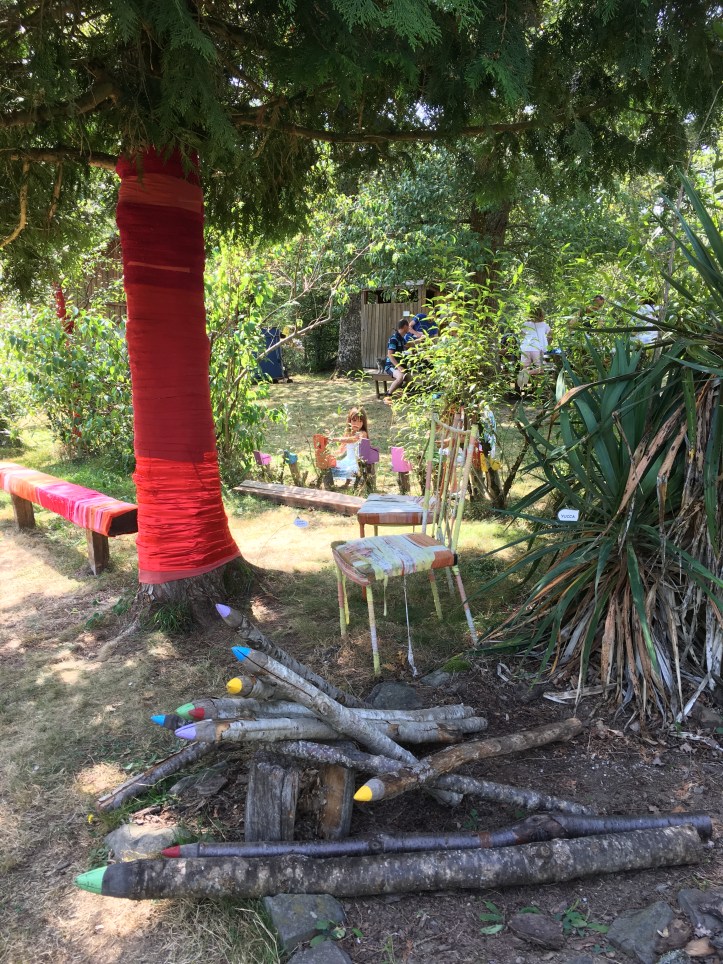 Que dites-vous de ces crayons géants réalisés à base de branches d’arbre et de ces galets géants de toutes les couleurs ?