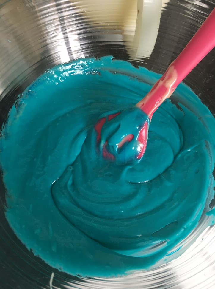 Pour cette première étape, j’ai préparé 3 gâteaux basic (gâteau au yaourt et à la vanille) que j’ai coloré de manière différente.