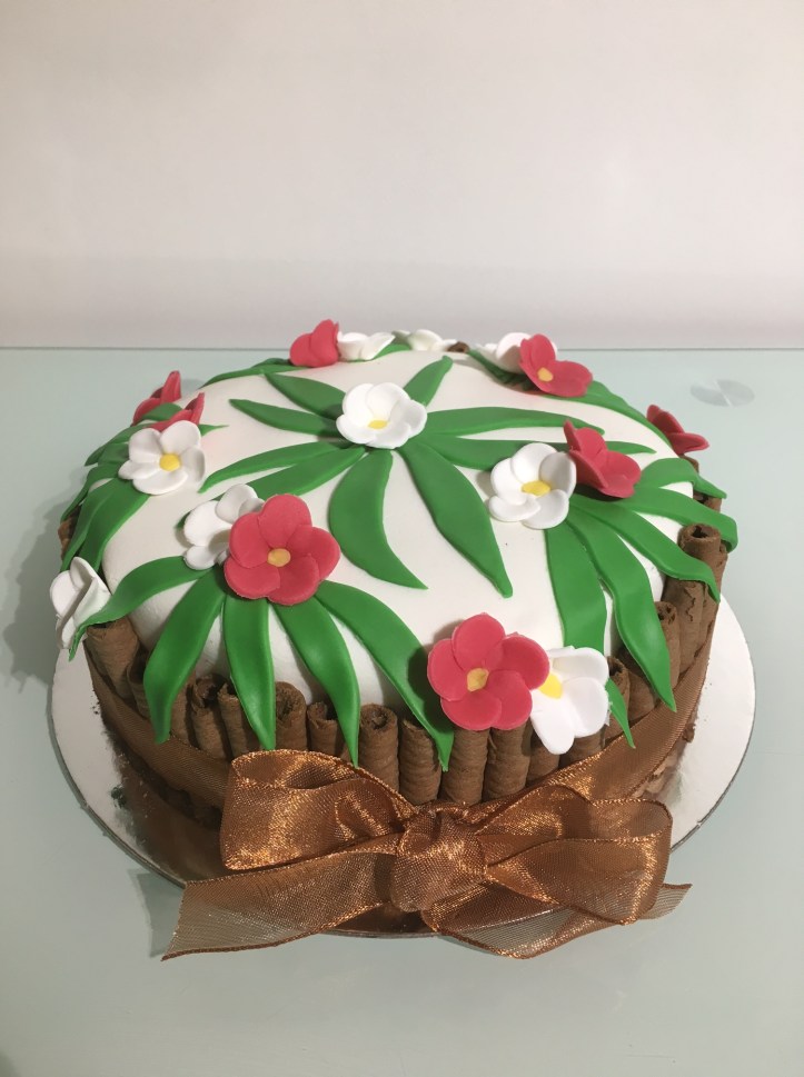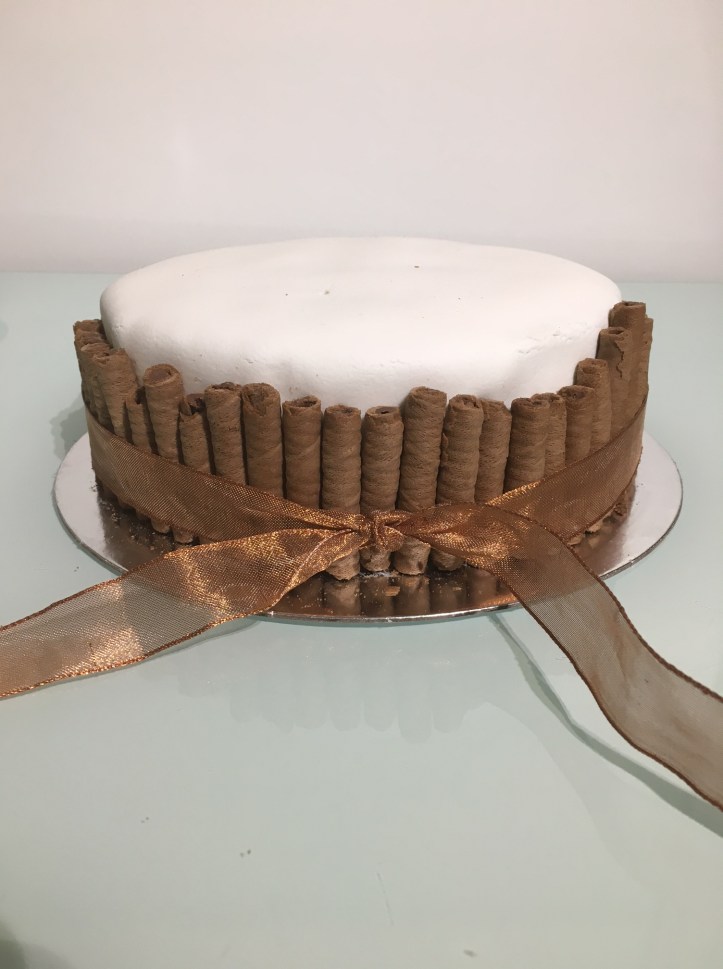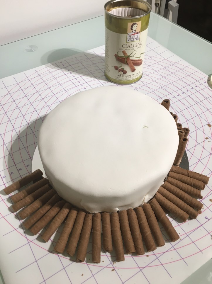 Pour rappeler les troncs des palmiers, j’ai tout d’abord ajouter des gâteaux en forme de cigarettes russes au chocolat tout autour du gâteau que j’avais au préalable recouvert de pâte à sucre blanche.