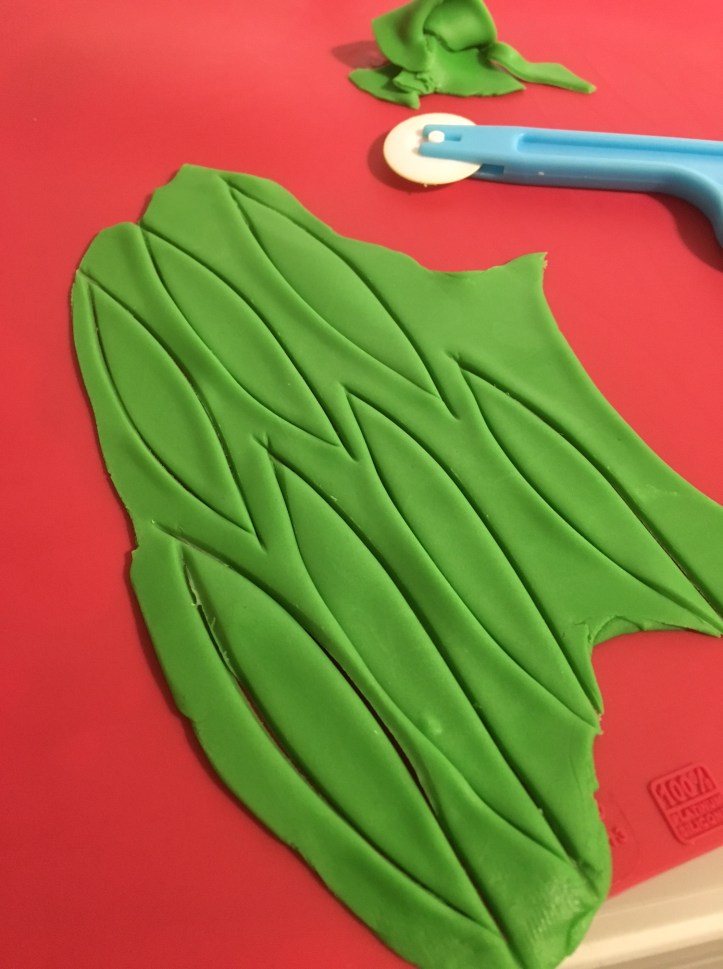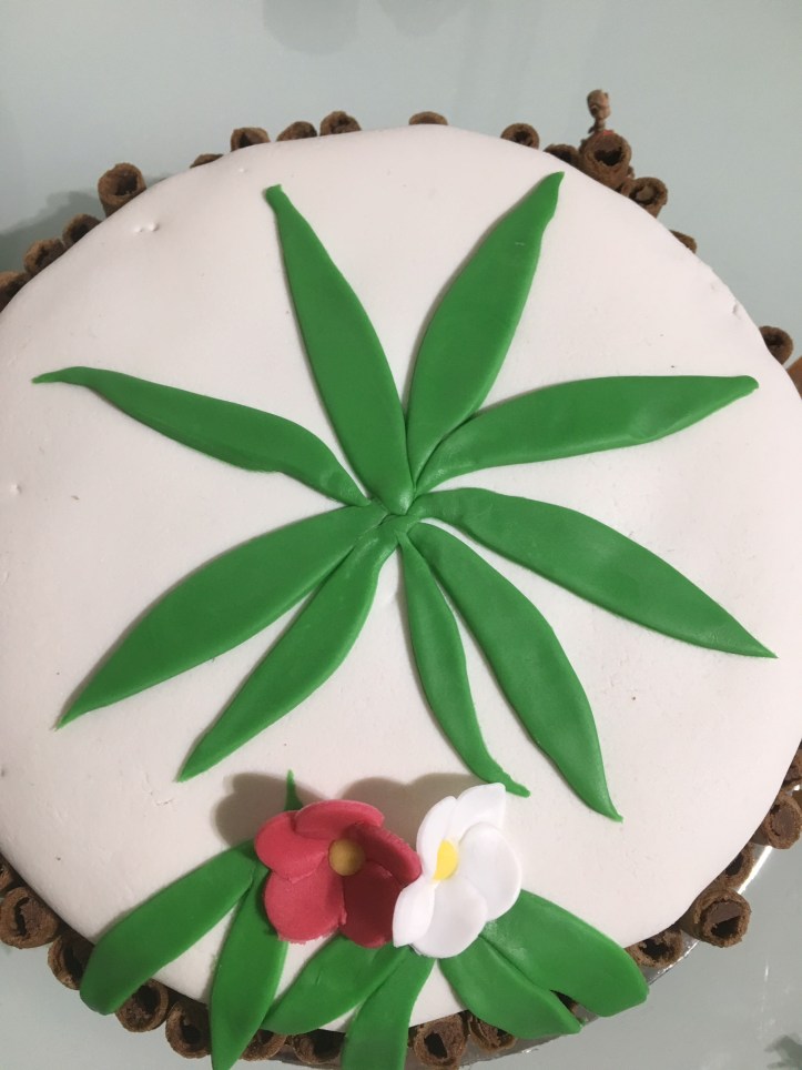 Pour donner un aspect exotique à ce gâteau, j’ai préparé des feuilles à base de pâte à sucre verte.