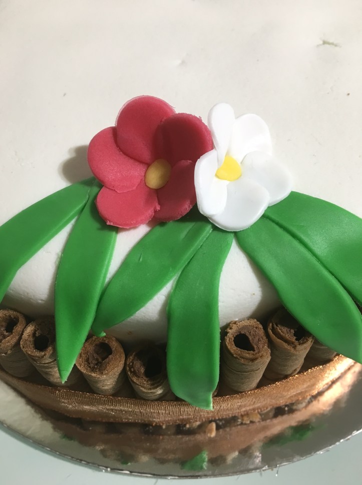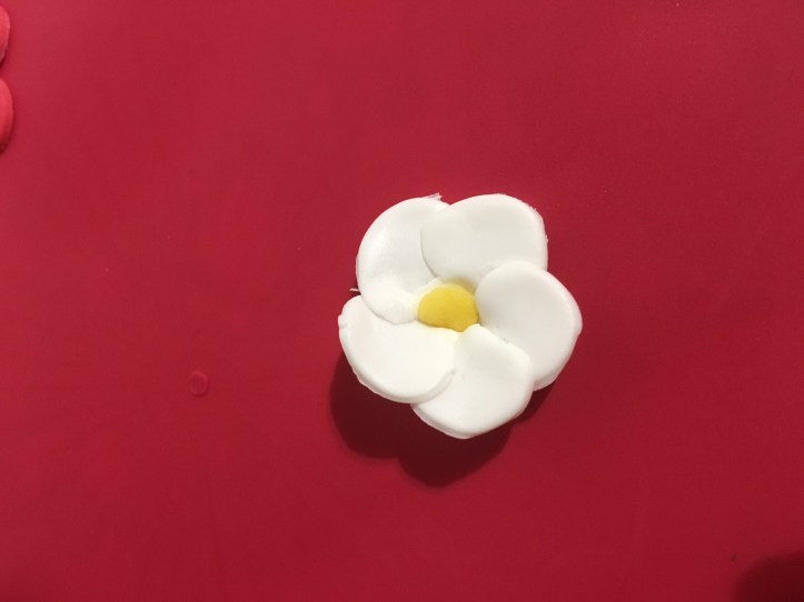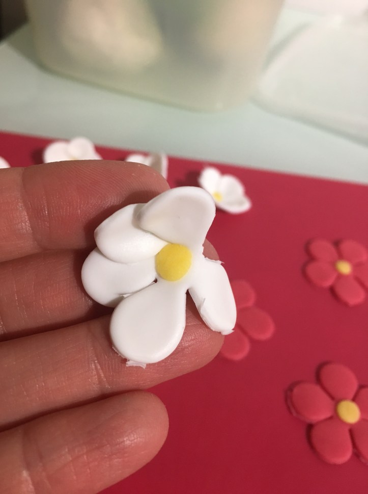 Les fleurs de frangipanier sont souvent blanches avec un coeur jaune mais il en existe aussi des roses avec le coeur jaune. J’ai donc réalisé des fleurs blanches et des roses auxquelles j’ai ajouté une petite boule de pâte à sucre jaune pour créer le cœur.