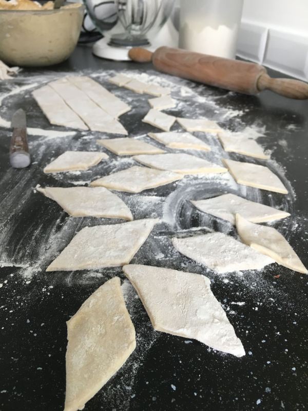 - Sortez la pâte de votre réfrigérateur, formez une boule de la taille d’une balle de tennis, étalez-la au rouleau sur 1/2 cm d’épaisseur et découpez en bandes de 5 à 7 cm de large. Coupez ensuite les bandes dans le sens opposé, de manière à former des losanges.