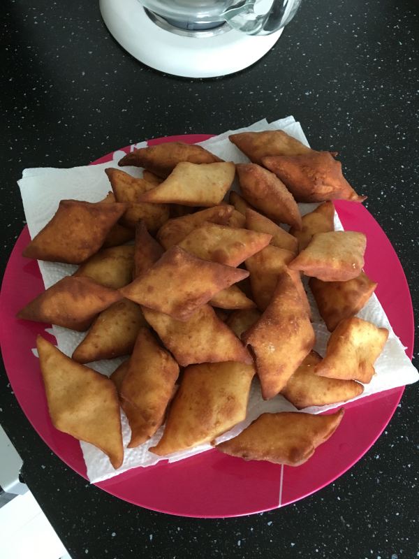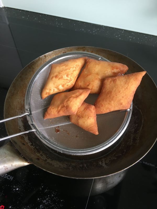 Déposez les losanges de pâte délicatement dans l’huile chaude de manière à éviter les projections et laisser frire pendant 3 à 5 minutes, jusqu’à ce que les beignets gonflent et soient bien dorés. - Sortez les beignets à l’aide d’une écumoire et déposez-les sur une grille tapissée de papier absorbant. Laissez refroidir les beignets.