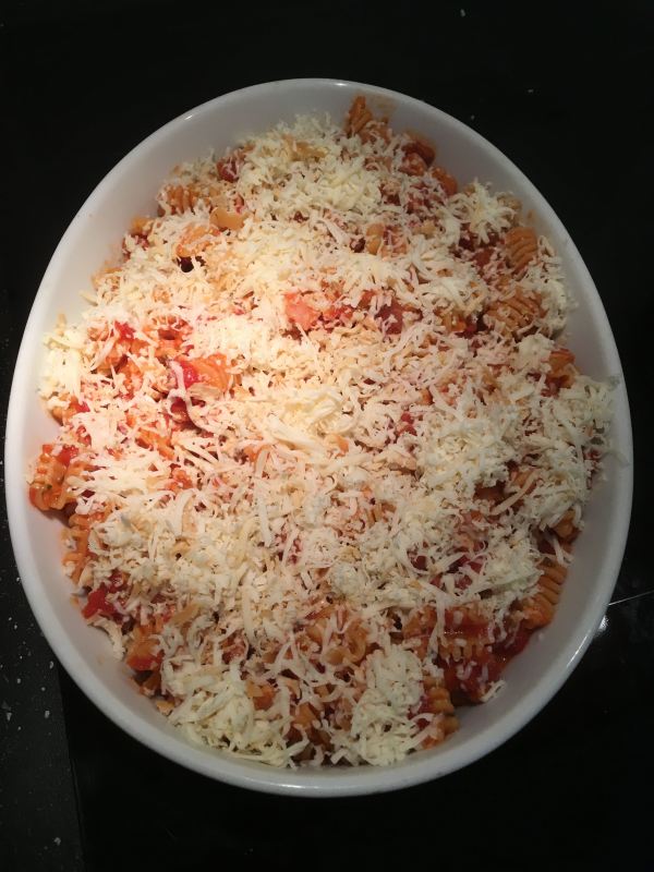 - Versez les pâtes et la sauce dans un plat allant au four et parsemez la scamorza.