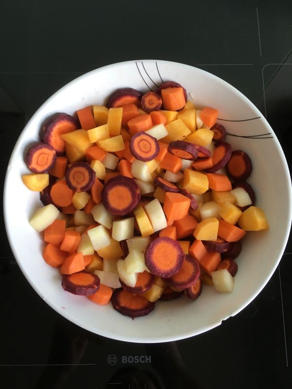 Pour cette version, j’ai choisi la carotte comme légume principal. Je l’ai décliné dans toutes les couleurs : orange, blanche, jaune et violette.