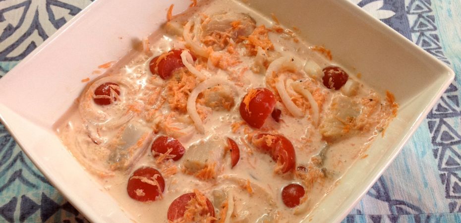 - Pendant ce temps, coupez les tomates en morceaux, pelez et détaillez le concombre également. Rappez les carottes. Épluchez et pressez l’ail. Retirez la peau et émincez l’oignon en lamelles. Ajoutez tous les légumes au poisson et mélangez.
