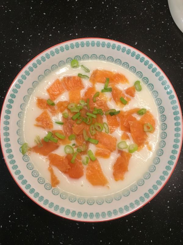 - Versez le velouté de choux-fleur dans des grands bols. Parsemez de saumon fumé et pour les adultes ajoutez de la ciboule (les enfants n’apprécient généralement pas les herbes fraîches sur les plats).