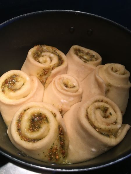 - Préchauffez le four à 180°C (thermostat 6). Nappez chaque bande de pâte de pesto, puis roulez-là sur elle-même. Disposez les petits rouleaux ainsi obtenus dans un moule en les serrant bien les uns contre les autres. Arrosez d’un filet d’huile d’olive et parsemez de fleur de sel.