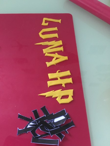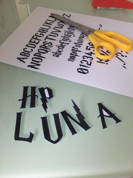 Après avoir imprimé puis découpé les lettres du prénom de Luna ainsi que les initiales d’Harry Potter, j’ai utilisé ces modèles pour découper ma pâte à sucre.