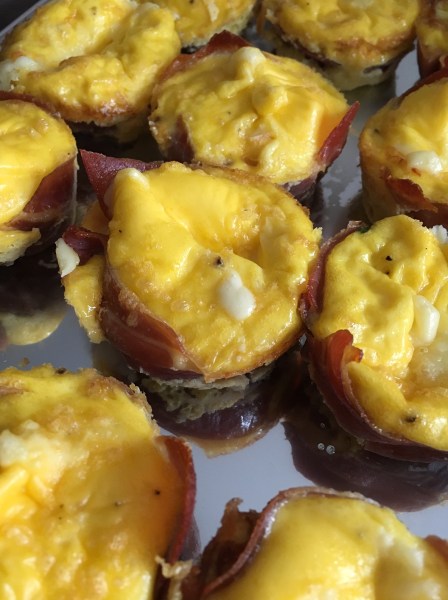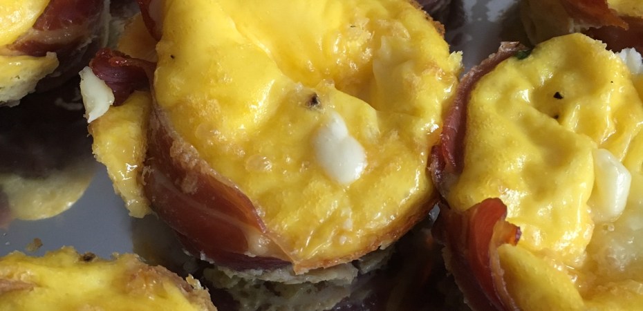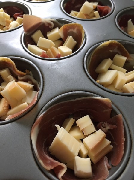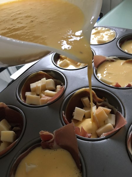 - Beurrez légèrement des moules à muffins puis tapissez-les de jambon afin de former une coupelle. Ajoutez le fromage.