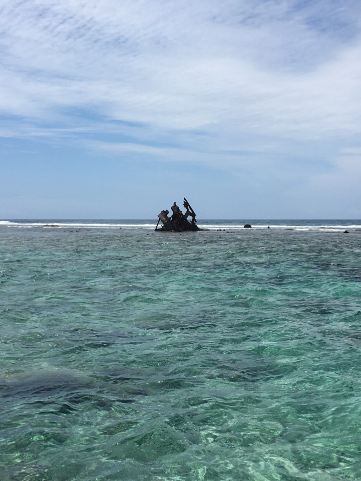 Nous avons beaucoup aimé la promenade dans le lagon. L’eau est si claire que l’on peut voir les fonds. En chemin, nous avons fait un stop près de l’épave d’un bateau hollandais qui s’est échoué sur la barrière de corail.