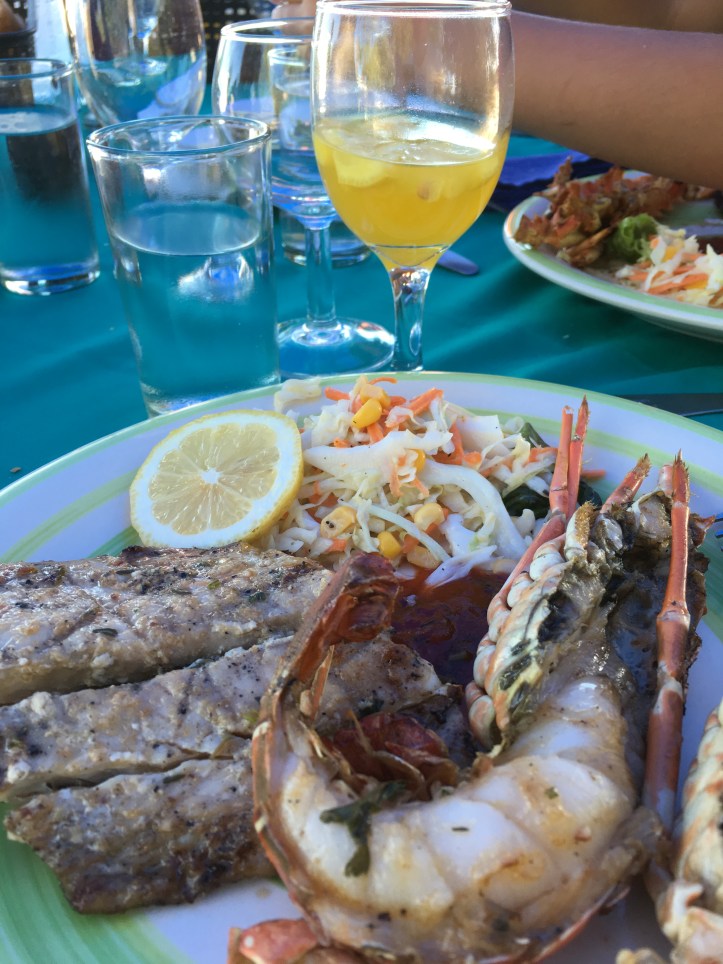 Nous avons pu lézarder sur les belles plages et déguster un copieux déjeuner composé de langouste et de poisson grillé, le tout accompagné de salade fraîche et punch maison.