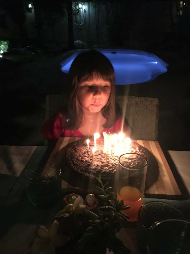 Nous avons été accueilli comme des princes. La table était joliment décorée et notre chouquette a pu souffler ses 7 bougies sur un superbe gâteau au chocolat.