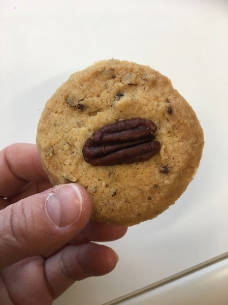 - Déposez chaque morceau sur la plaque du four recouverte de papier sulfurisé et ajouter un morceau de cerneaux de noix de pécan sur le dessus.