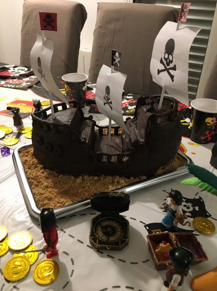 Comme pour la plupart de mes gâteaux, j’ai utilisé des personnages pour décorer le gâteau. Pour ce galion j’ai utilisé les Playmobils pirates.