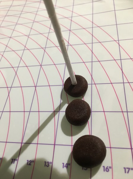 Pour créer les canons, il faut tout d’abord former une petite boule de pâte à sucre marron puis l’applatir légèrement. A l’aide d’un batonner, on forme le tube du cannon en appuyant doucement.