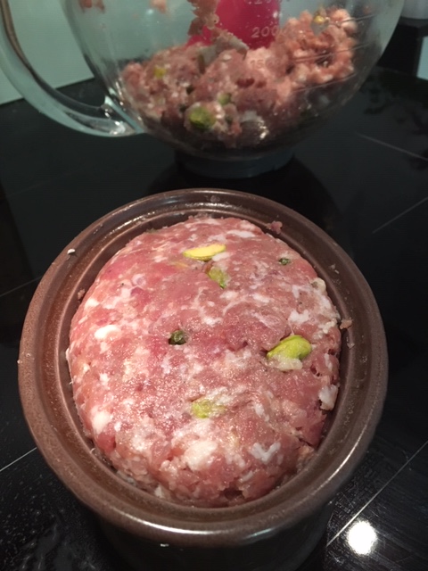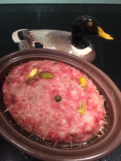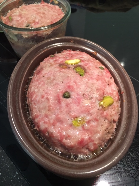 L’organisation d’un apéro dînatoire à la maison m’a donné l’occasion d’utiliser ce plat pour préparer une terrine à base de canard mais aussi de poivres vert et de pistaches.